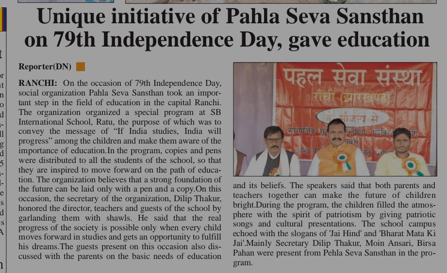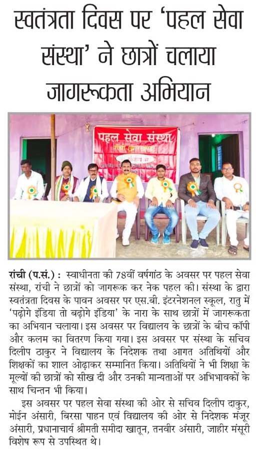 रांची: 79वें स्वतंत्रता दिवस के अवसर पर राजधानी रांची में सामाजिक संस्था पहल सेवा संस्था ने शिक्षा के क्षेत्र में एक महत्वपूर्ण कदम उठाया। संस्था ने एसबी इंटरनेशनल स्कूल, रातू में विशेष कार्यक्रम का आयोजन किया, जिसका उद्देश्य बच्चों के बीच “पढ़ेगा इंडिया तो बढ़ेगा इंडिया” का संदेश पहुंचाना और उन्हें शिक्षा के महत्व के प्रति जागरूक करना था।